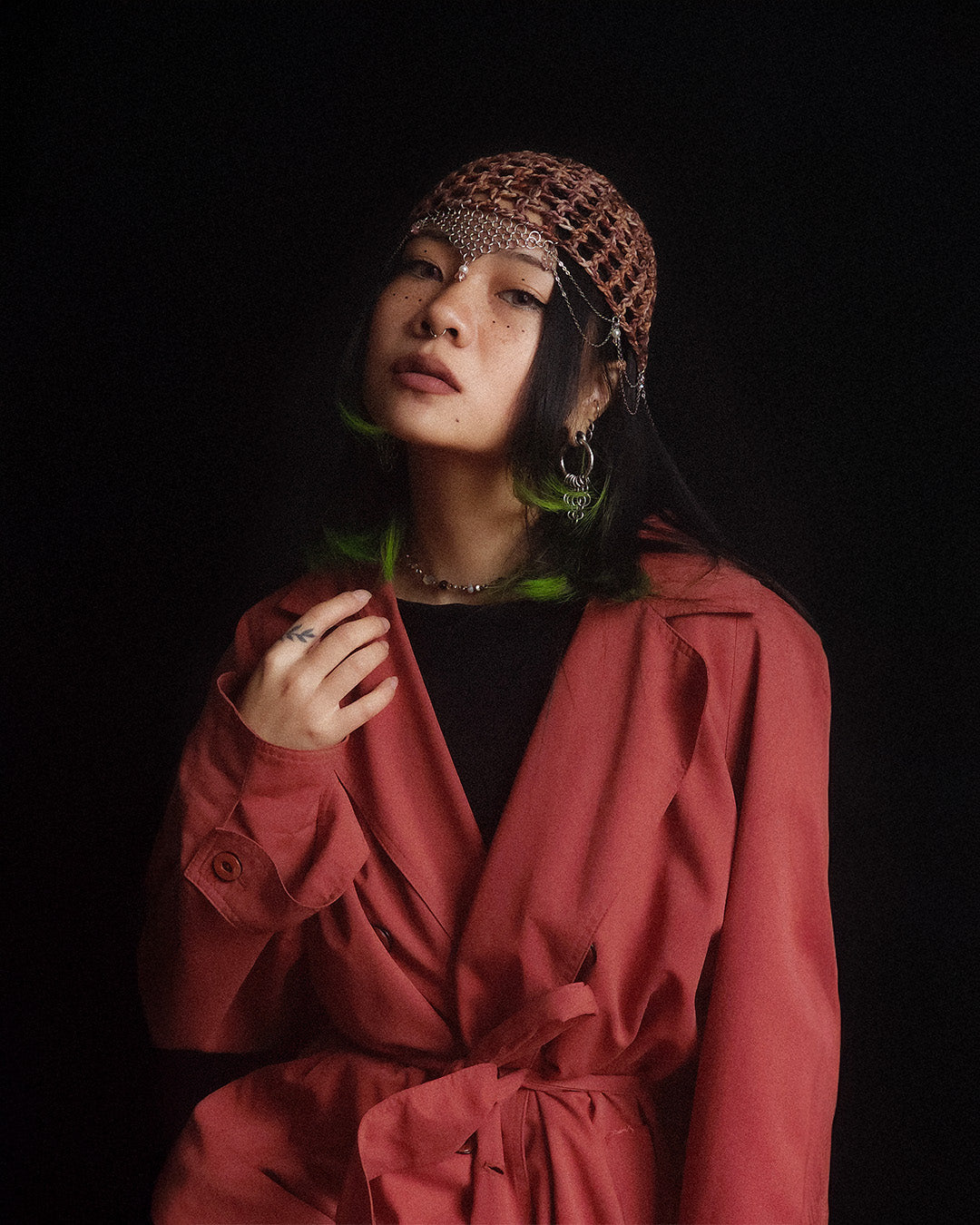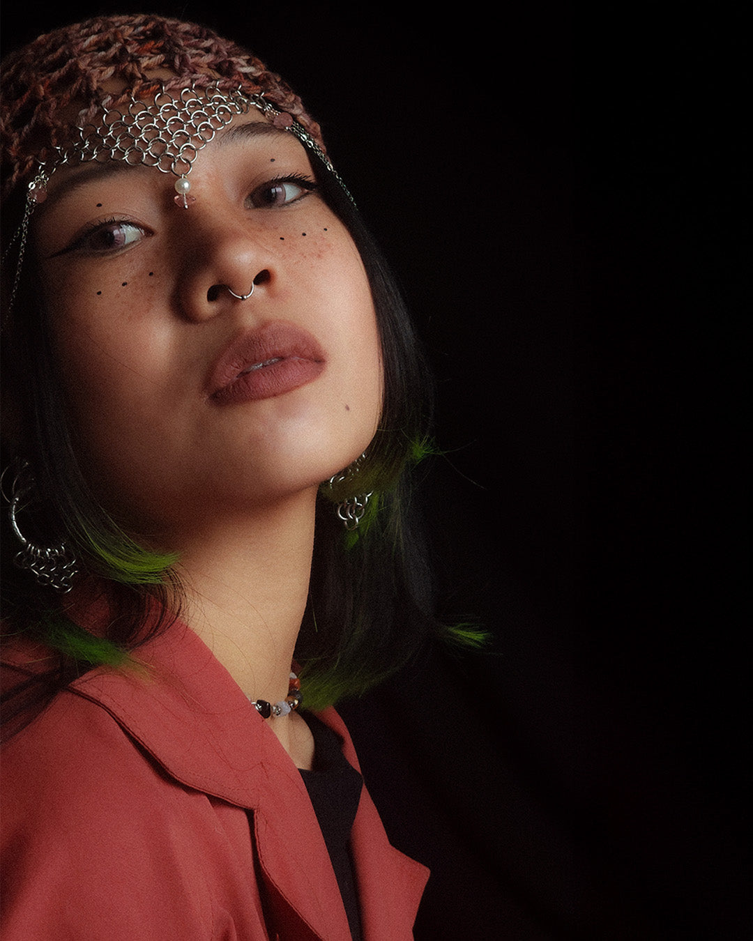 Stainless steel chains and rings, glass and stone beads.