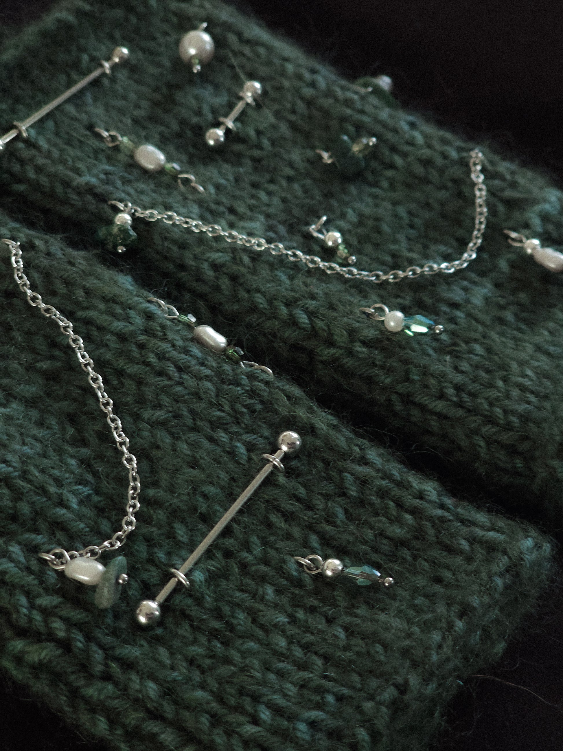 Stainless steel chains and rings, glass and stone beads, accessories.