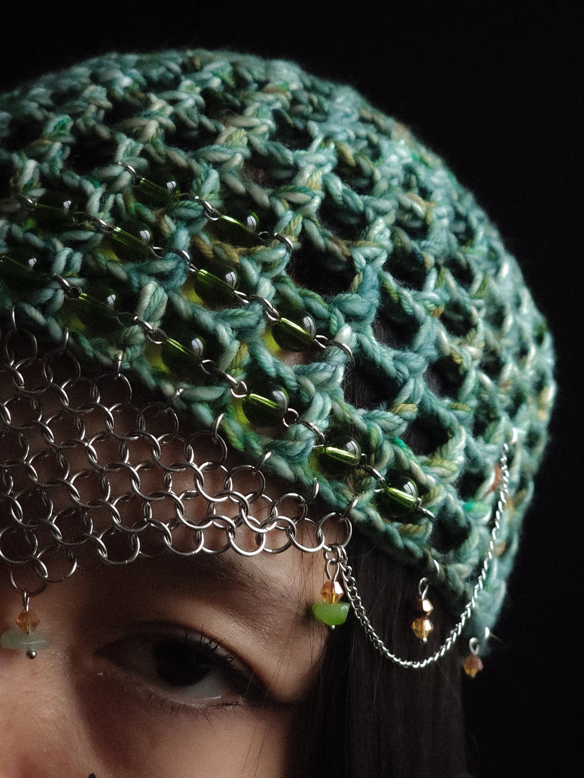 Stainless steel chains and rings, glass and stone beads.